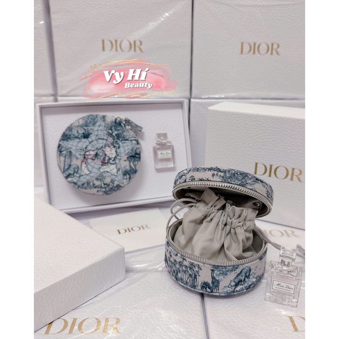 Set Dior gồm 1 túi đựng makeup tròn họa tiết xanh + 1 nước hoa Blooming Bouquet 5ml