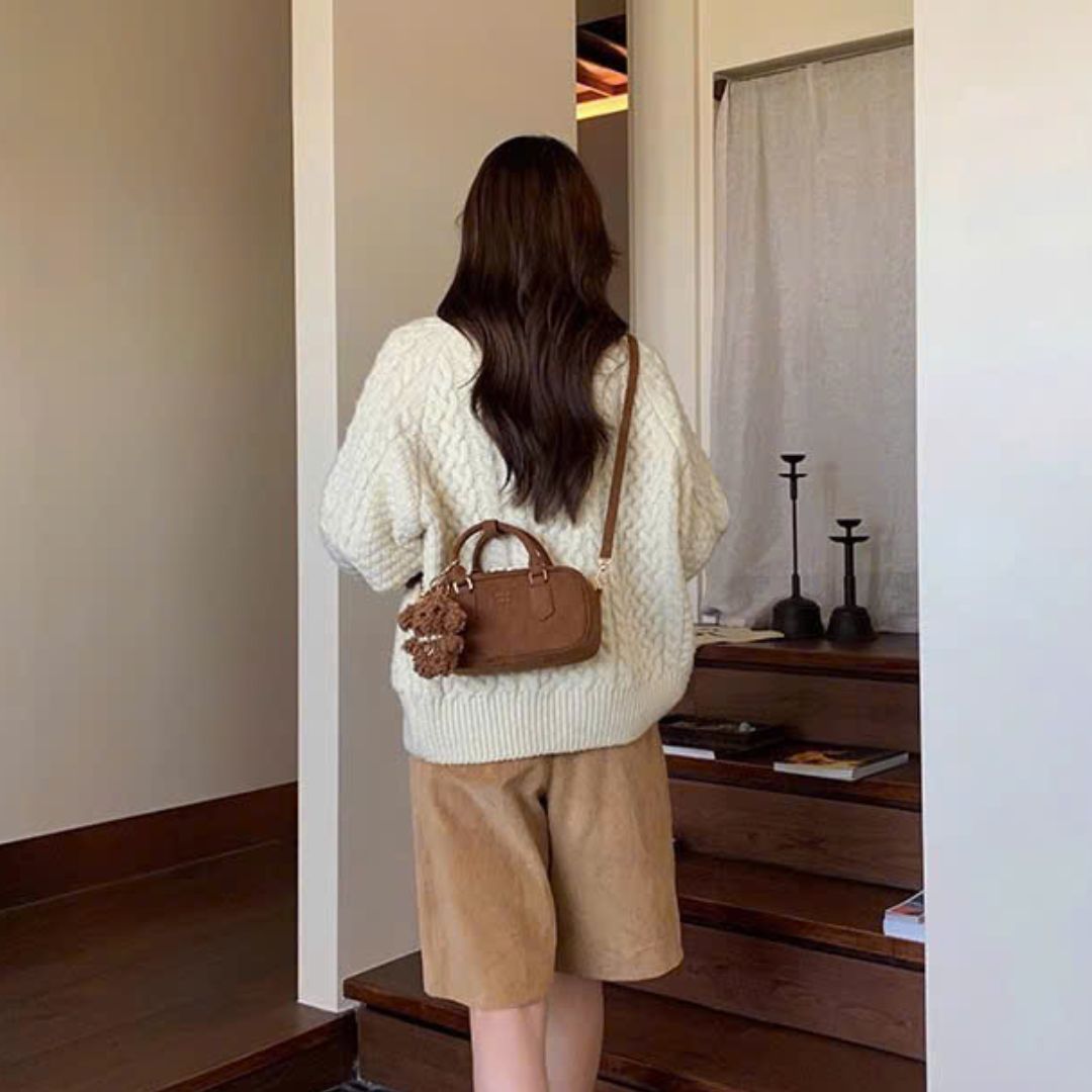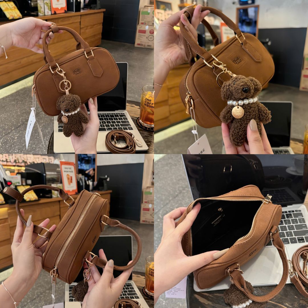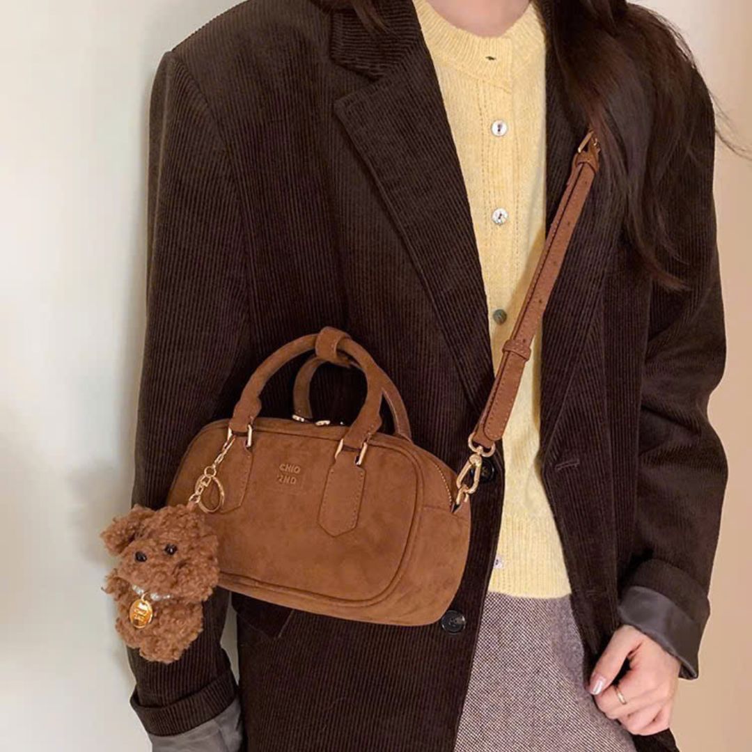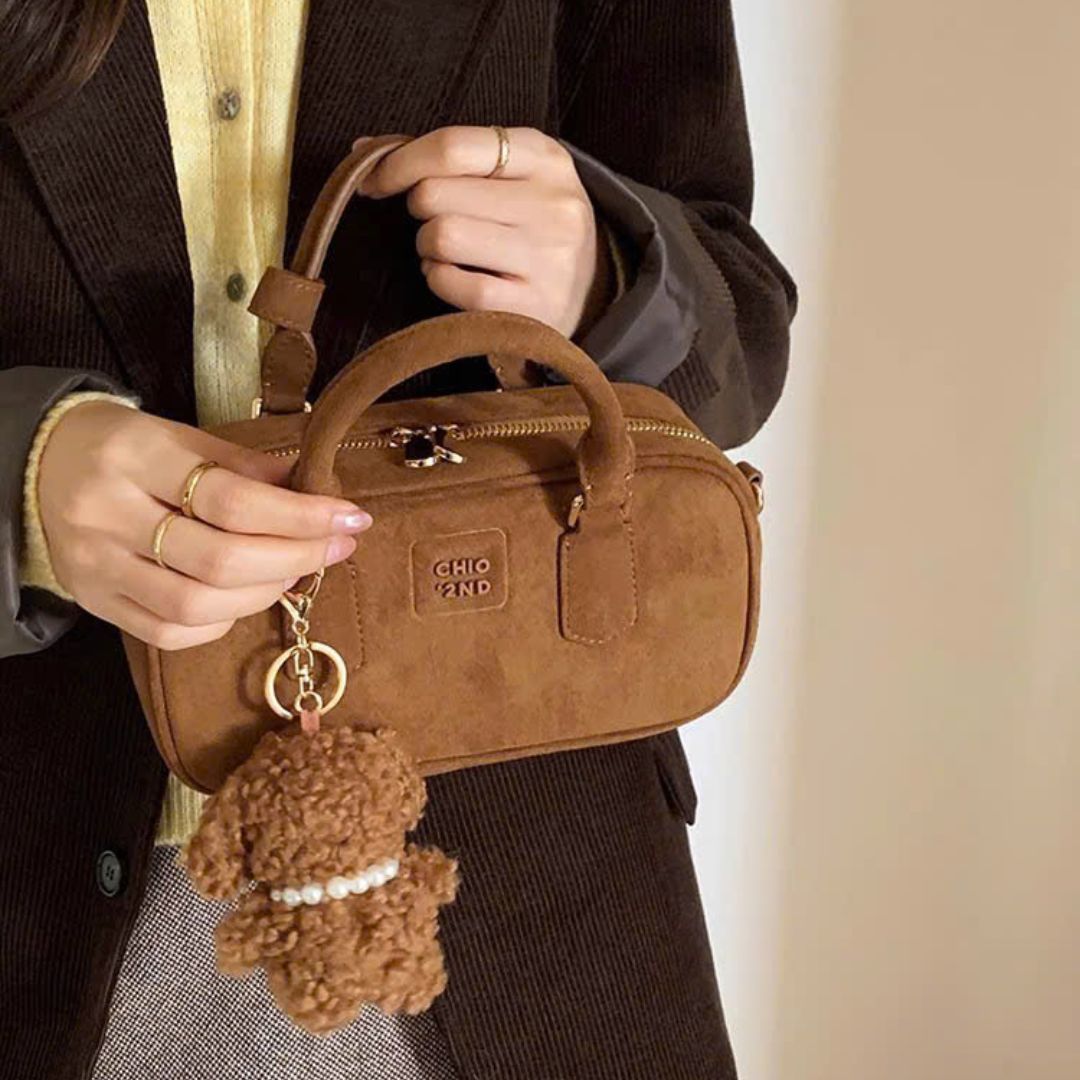 Túi Chio2nd da lộn màu nâu cổ điển kèm charm cún 23cm