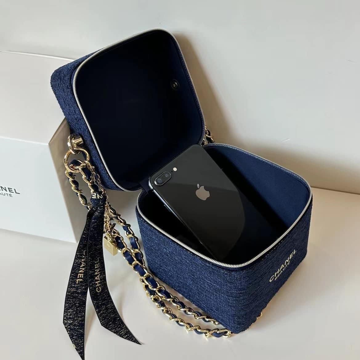 Túi đựng Makeup Chanel XANH DENIM kèm PHỤ KIỆN 13 x 13 x 13 cm